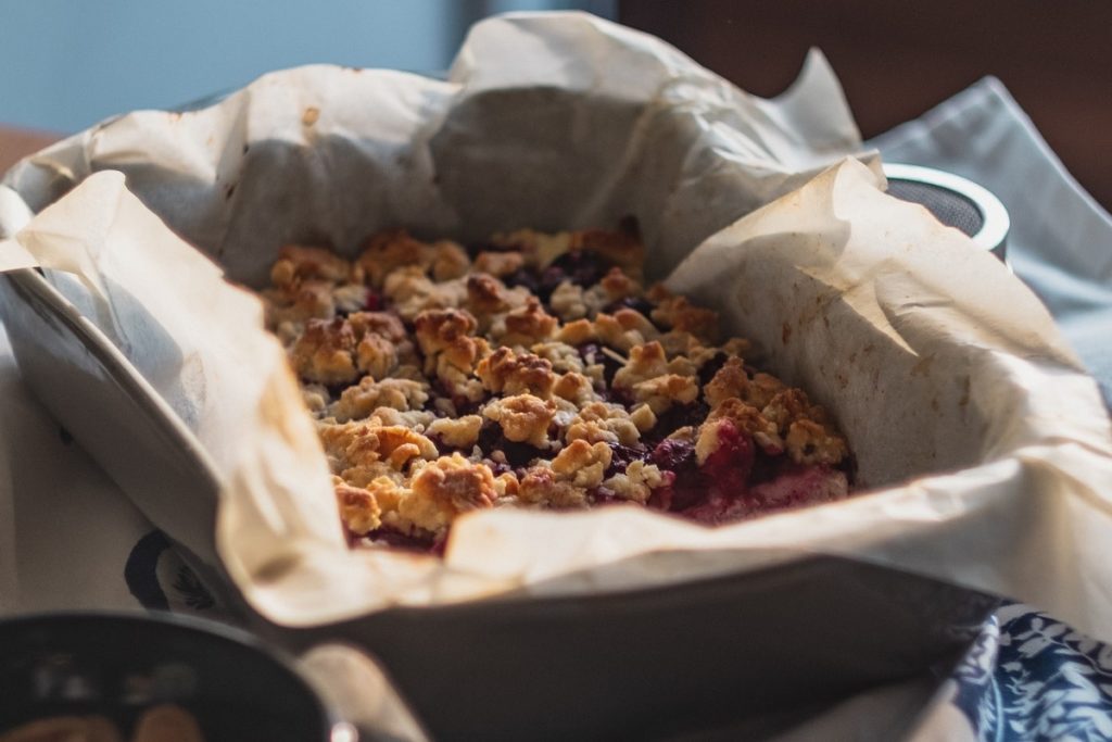 Recept voor 12 repen. Ingrediënten: • 270 gr boter • 100 gr lichtbruine basterdsuiker • 150 gr bloem • 50 gr geraspte kokos • ½ tl vanille extract • 240 gr plakjes appel • 125 gr frambozen • 100 gr blauwe bessen • 1 ½ el citroensap • 2 tl maizena • 1…